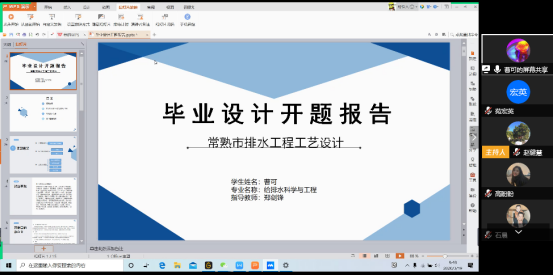 防控疫情延迟返校期间,响应公司“停课不停教、停课不停学”要求,为了进一步规范毕业设计(论文)的过程管理,保质保量完成本科生毕业设计(论文)工作,依据公司毕业设计(论文)的相关要求,公司制定了关于开展2020届毕业设计(论文)开题汇报工作的实施方案,从3月9日开始,公司师生聚“云”端进行毕业设计(论文)开题汇报。汇报分为9个小组进行,分别为污水1组、污水2组、给水1组、给水2组、建水组、工业水1组、工业水2组、大气组和论文组,每组由经验丰富的指导老师任组长,5-7位指导老师任委员。各小组分别采用腾讯会议、QQ群等方式进行。现已多个小组完成开题汇报,其他小组紧锣密鼓、陆续开展,计划在3月底之前全部完成。