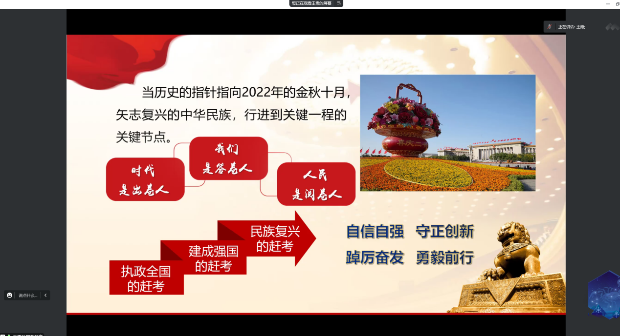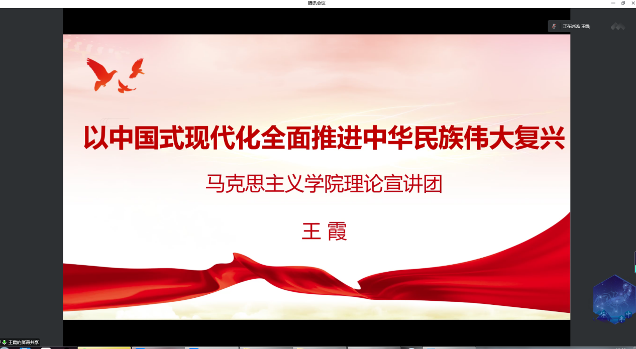 王霞以《以中国式现代化全面推进中华民族伟大复兴》为题,结合党的二十大精神,从处于关键历史关口的一次重要盛会、新时代新征程中国共产党的使命任务、以中国式现代化全面推进中华民族伟大复兴三个方面进行详细阐述,强调要更加紧密地团结在以习近平同志为核心的党中央周围,全面贯彻习近平新时代中国特色社会主义思想,牢记空谈误国、实干兴邦,坚定信心、同心同德,埋头苦干、奋勇前进,为全面建设社会主义现代化国家、全面推进中华民族伟大复兴而团结奋斗!