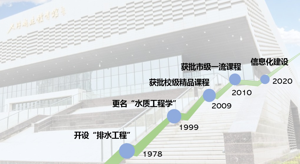 本课程前身为天津大学建筑分校(球报体育前身)成立之初开设的“排水工程”课程;2005年,课程由“排水工程”更名为“水质工程学(2)”;2008年,被评为校级精品课,课程网站建立并运行;2020年,获批天津市一流本科建设课程;给排水科学与工程专业获批国家级一流专业建设项目;2020年,课程组教师作为骨干成员的“水质科学与技术教学团队”获批天津市级教学团队;2021年,探索线上线下教学模式,采用雨课堂等信息化工具进行教学。