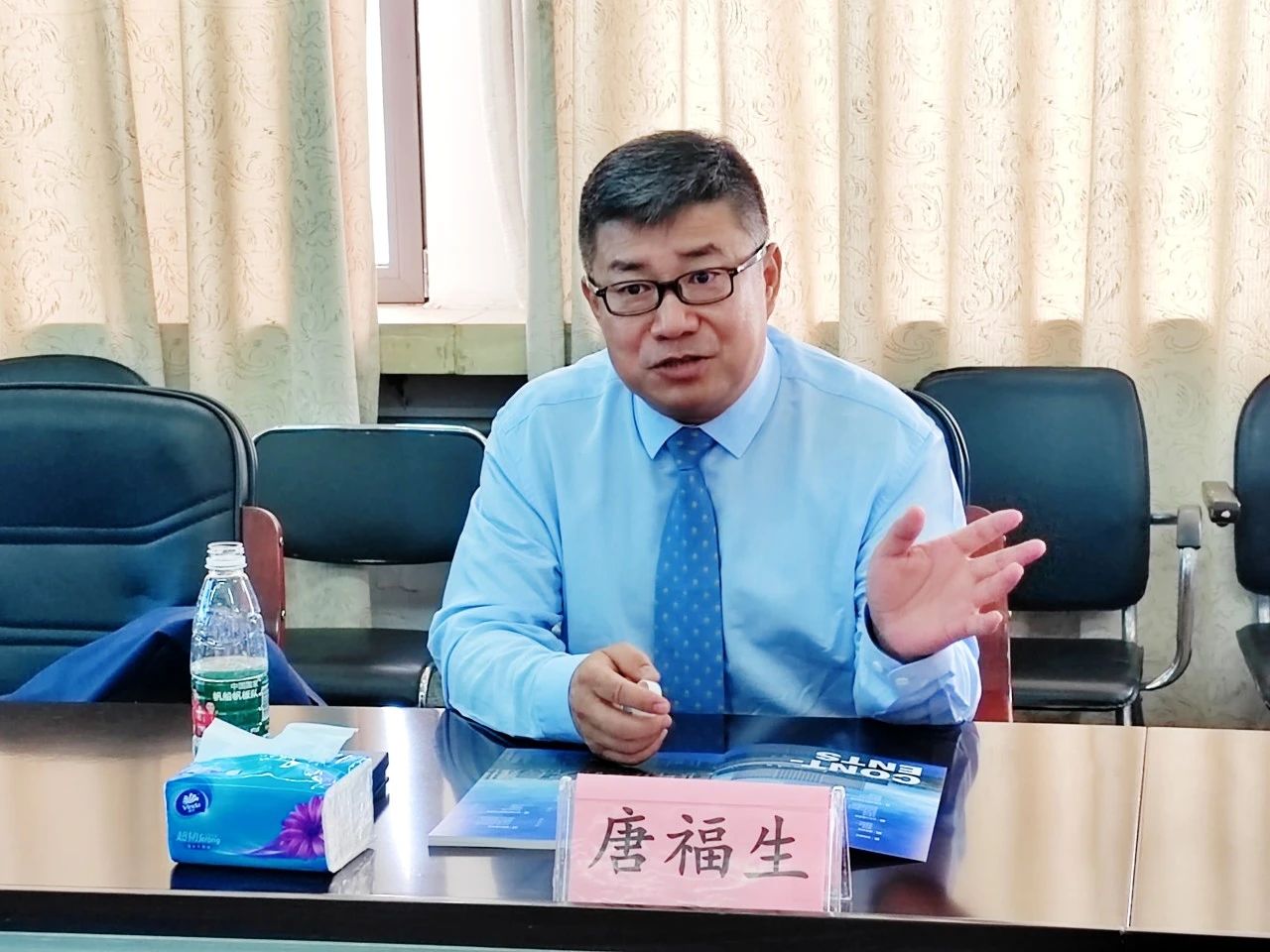 刘志华代表公司向唐福生多年来心系母校、支持母校的情谊表示衷心感谢。并就近年来公司发展情况、取得成果、科研实力、招生政策、研究方向等方面向各位员工进行了详细介绍。