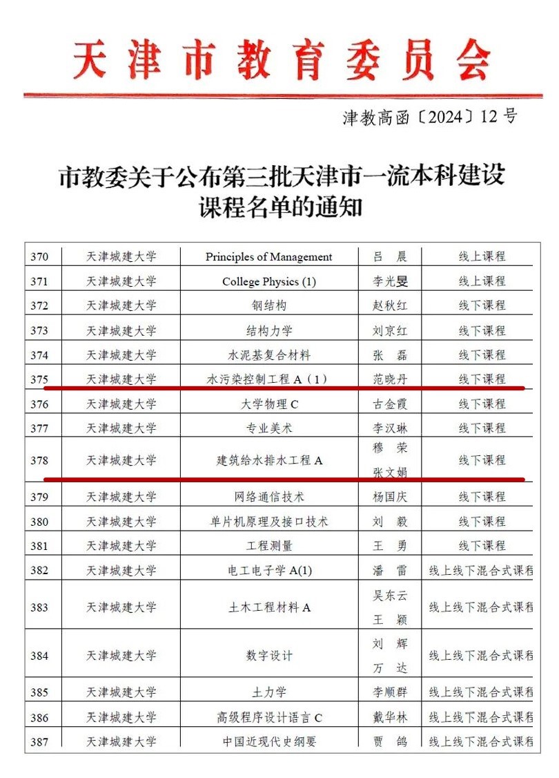近日,天津市教委发布《市教委关于公布第三批天津市一流本科建设课程名单的通知》(津教高函〔2024〕12号),公司范晓丹教授主持申报的线下课程《水污染控制工程A(1)》和穆荣副教授、张文娟副教授主持申报的线下课程《建筑给水排水工程A》被认定为天津市一流本科建设课程。
