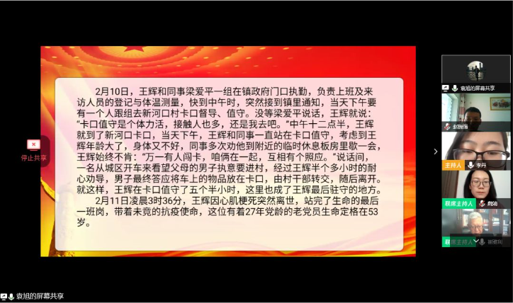 此外,由支部付啸、梁婷、袁旭三名党员带领大家进入党日活动第二项议程“讲故事给你听”,分别讲述了王尔唐,王辉,单玉厚,张世林,孙术祥,张成银六位在抗击疫情一线牺牲的党员的先进事迹。在这几位党员的身上,我们看到了共产党人敢于奉献,勇于担当,舍生忘死的崇高精神。