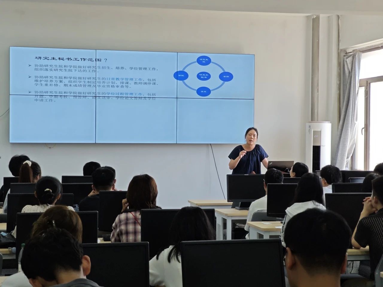 研究生秘书钟玲玲老师详细为同学们介绍学业相关流程细节,并着重强调研究生学位管理规定与学术道德规范指导、公司产品管理规定解读与学业规划指导。学办马月轩、赵博宇老师分别为同学们介绍员工工作内容及后续服务管理工作的开展情况。