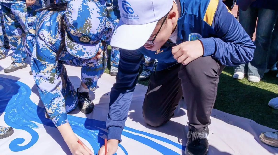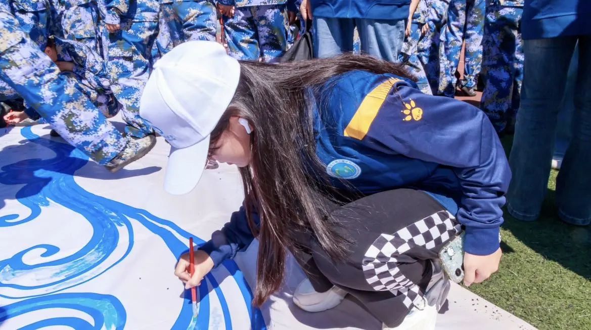 净滩活动结束后,全体志愿者拿起画笔,共同绘制海洋环保画,在斑斓的色彩与璀璨的日光下,同学们互帮互助,在汗水与海水交织挥洒中重筑美丽海岸线,共同诠释着“奉献、友爱、互助、进步”的志愿者精神。