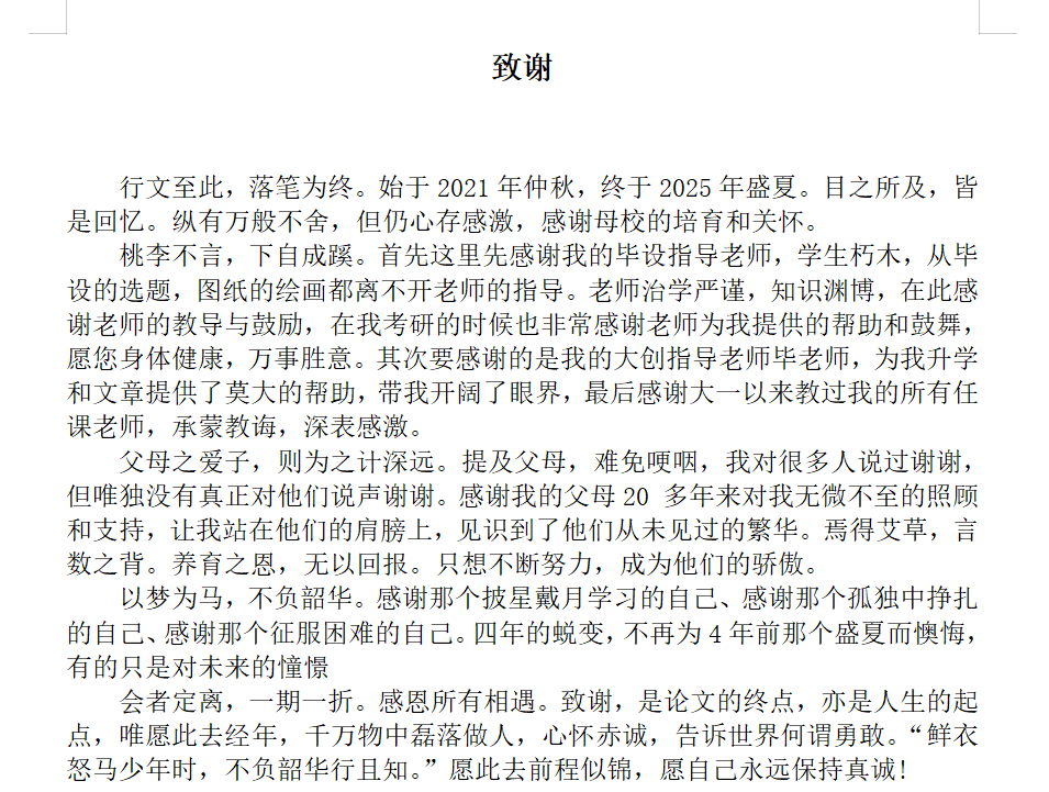 这些写在致谢里的“小作文”,是学术旅程的暖心彩蛋,也是青春散场时的限定情书。合上论文的瞬间,带着实验室沾的试剂香、图书馆的咖啡渍,还有满脑子的专业知识,这群少年要去建设会呼吸的城市、守护会唱歌的河流啦!
