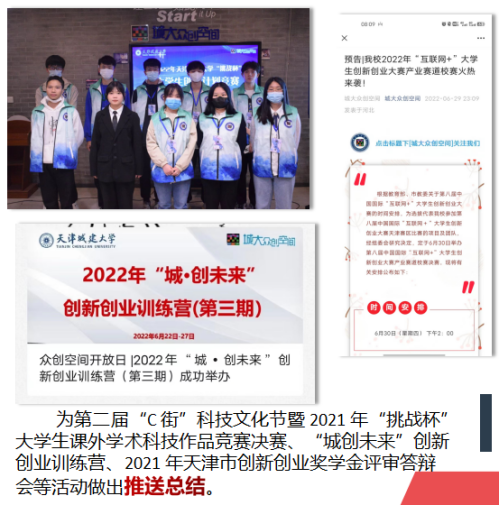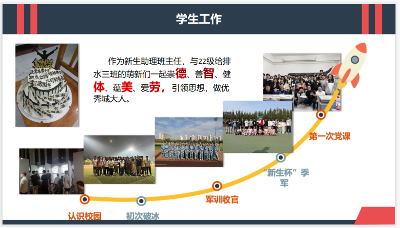 学习工作双发展,在员工工作中,作为积极分子,我为学弟学妹答疑解惑,探讨学习方法,作为城大众创空间网信部部长,我曾为“城创未来”创新创业训练营等活动做出推送总结,以增强公司创新创业氛围,提高各类竞赛关注度。作为22级水3助理班主任,我与搭档一起带领新生崇德、善智、健体、蕴美、爱劳,一起做优秀城大人。