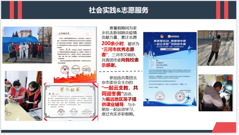 志愿:校社会活动单项奖、参加由共青团北京市委员会主办的“一起云支教,共同迎冬奥”活动,“三河市优秀志愿者”称号,在天津市“小我融入大我,青春献给祖国”实践活动中获得天津市级荣誉。共计志愿200余小时。