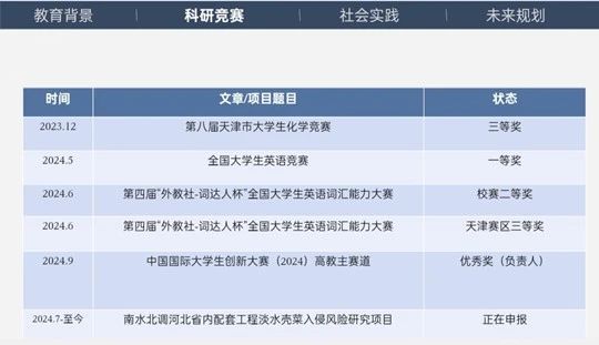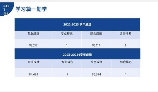 在大一和大二的四个学期中,我的成绩一直在专业前列,并保持着稳定进步状态。目前GPA已达4.14,专业排名第一,综合排名第一,大一学年综测成绩93.117大二学年综测成绩96.394分别获得2022-2023学年和2023-2024学年校一等奖学金,获得校优秀团员和优秀员工称号。