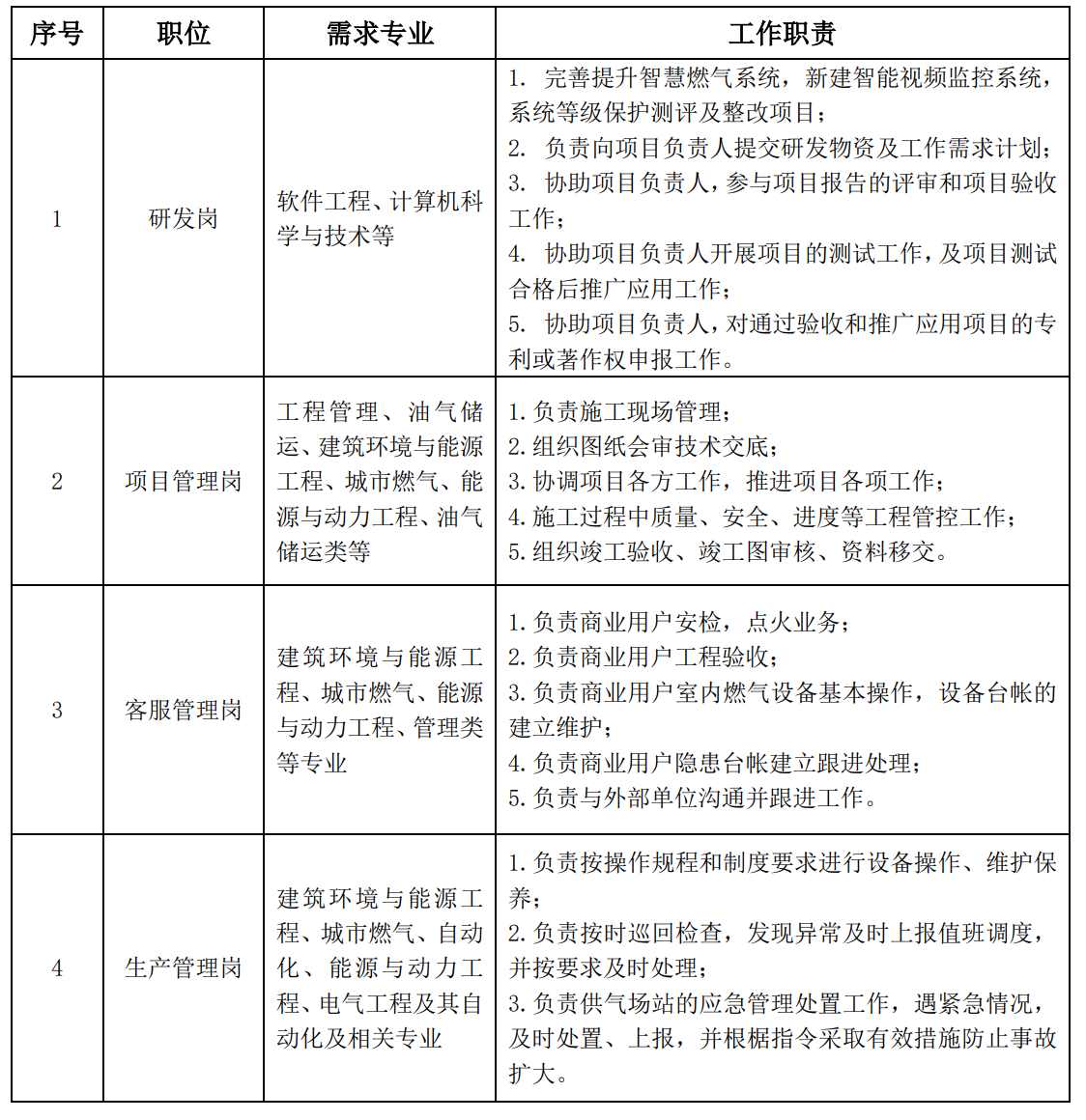 1、本科及以上学历,男女不限,燃气类、油气储运类、能动类、计算机类、化工类、机电类、电气类、工程类等专业,中共党员、在校成绩优秀、有体育特长或担任员工干部优先;2、认同公司企业文化,勤奋好学,有良好的沟通协调能力,待人亲和,能够与他人紧密合作、尽快融入团队;责任心强,有良好的团队协作精神;