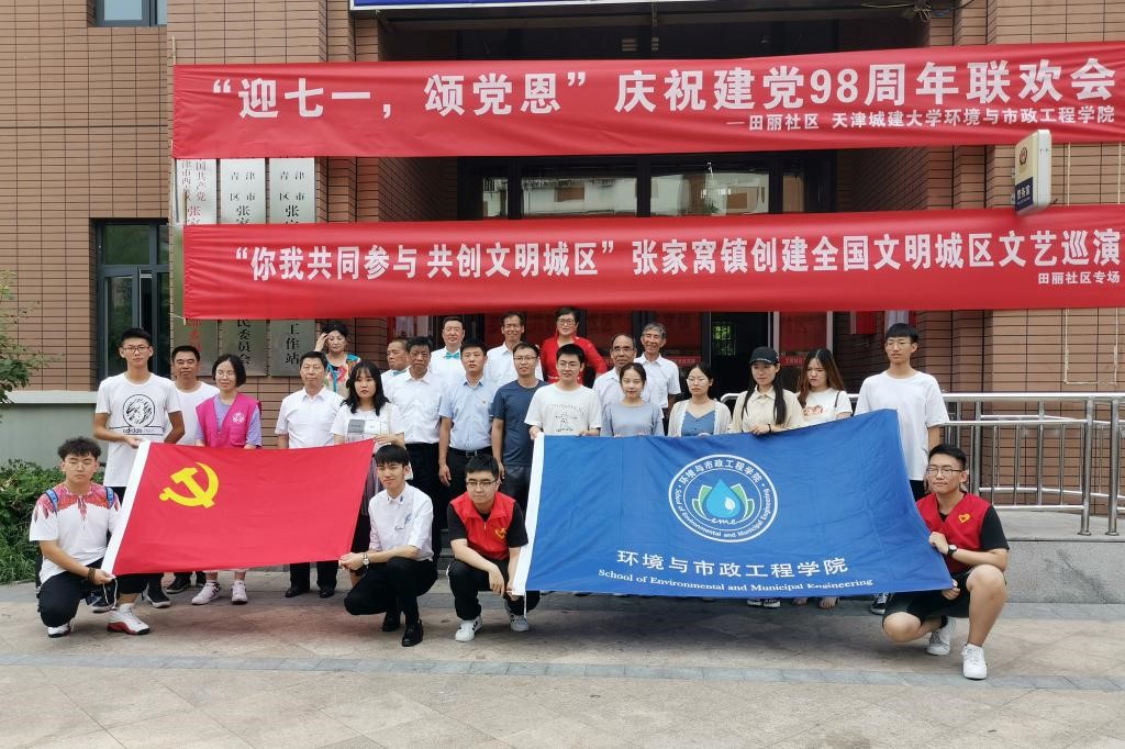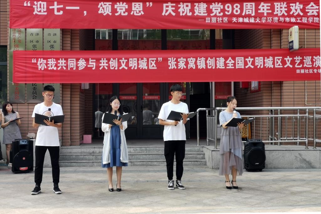 6月29日上午,球报体育师生党员来到西青区张家窝镇田丽社区党群服务中心与田丽社区党员们共同举办“迎七一,颂党恩”庆祝建党98周年联欢会,为中国共产党98岁生日献上祝福。