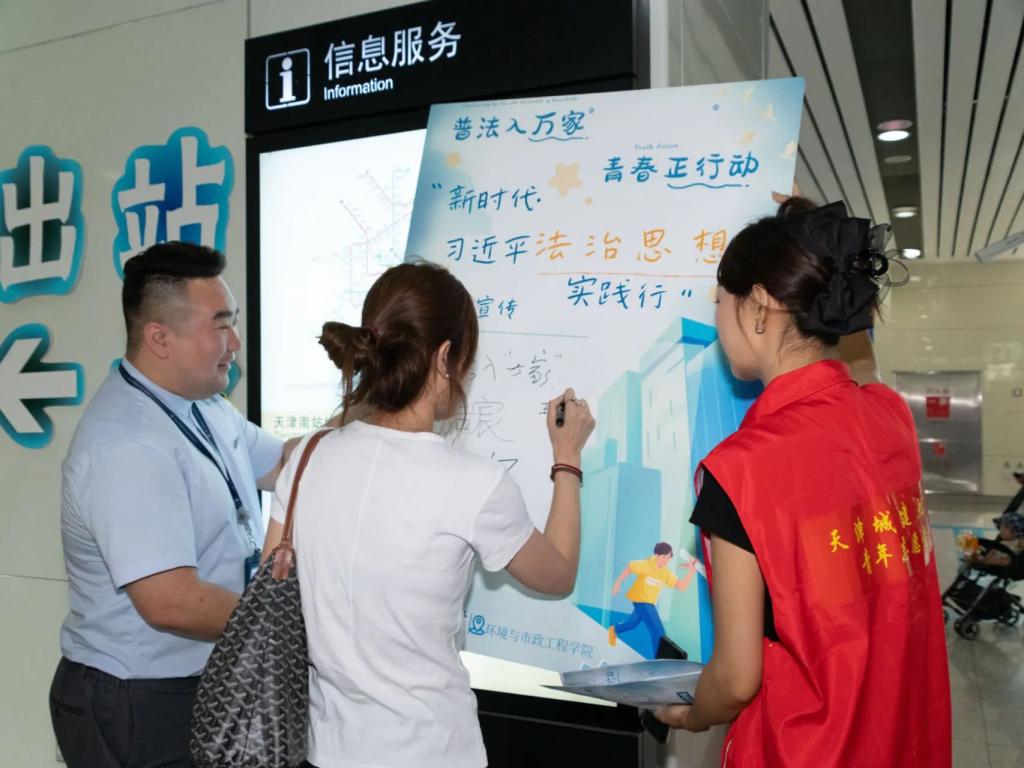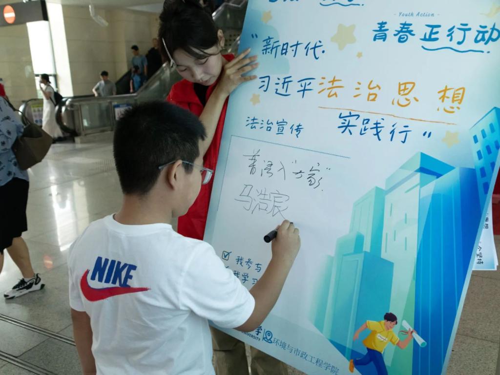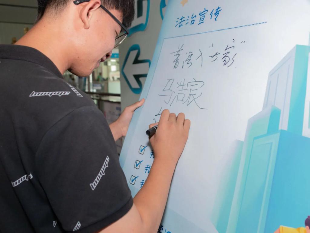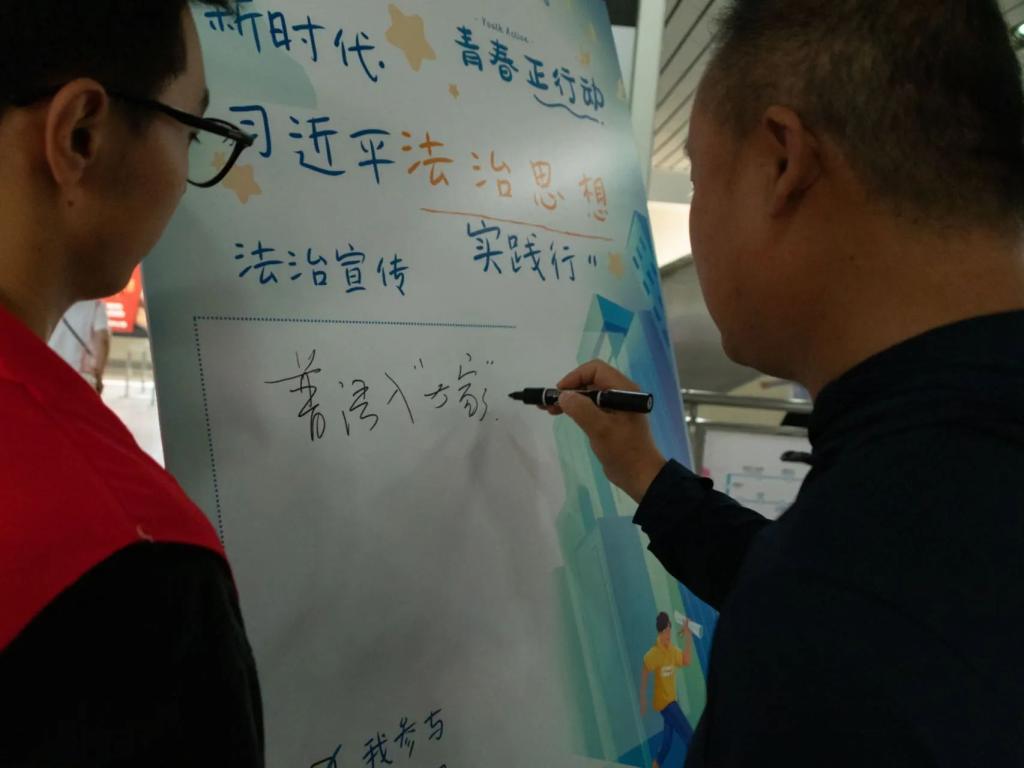 青春靓丽的身影、生动有趣的宣讲很快吸引了来往乘客的目光,活动现场热烈而有序,在仔细阅读完宣传材料后,青年普法团成员邀请过往乘客及工作人员在普法横幅及宣传展板上郑重签名,用一个个签名践行一次次庄严承诺,承诺将法治理念融入日常生活。